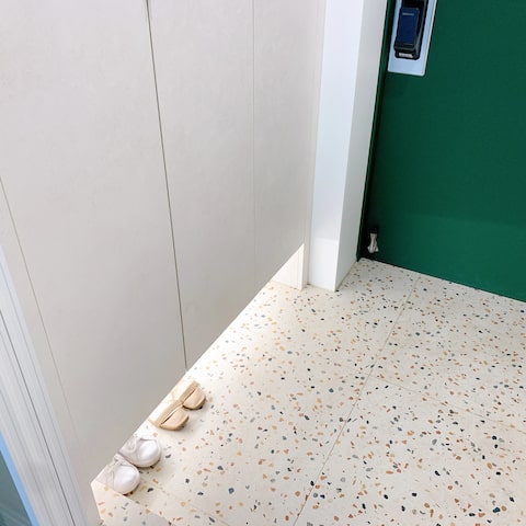 현관타일은 같은 디자인의 타일이지만 각수가 다른 타일인 포셀린타일 BL-BLTWHITE로 벽면은 600*1200각, 바닥과 발판은 600*600각으로 각각 마감을 하였습니다.큰 사이즈의 현관 타일을 시공하여 메시지 라인을 최대한 줄이고 깨끗하고 간결하게 보이도록 진행하는 것이 요즘 트렌드이기 때문에 작은 각수 타일을 찾는 경우가 많지 않은 편입니다.